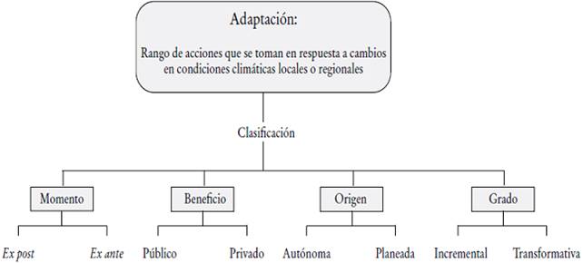 Existen distintas formas de clasificar las medidas de adaptación al cambio climático (véase el Diagrama 1). Cuando las medidas son reactivas se habla de medidas ex post, mientras que aquellas que se anticipan a los eventos se conocen como ex ante. Las medidas de adaptación pueden tener beneficios únicamente para el individuo que toma la decisión (medidas privadas) o pueden tener beneficios para un conjunto de individuos o agentes más allá del tomador de decisiones (medidas públicas). Dependiendo de su origen, la adaptación puede clasificarse también como autónoma o planeada. La adaptación autónoma se refiere a acciones tomadas voluntariamente por parte de los individuos o agentes, como las organizaciones de agricultores. Por su parte, la adaptación planeada se refiere a acciones o políticas implementadas por alguna organización, gubernamental o no, con el fin de complementar, fomentar o facilitar las respuestas de los agentes ante el cambio climático (Tubiello y Rosenzweig, 2008). Si se toma en cuenta el grado o la profundidad de las medidas, la adaptación se puede clasificar como incremental o transformativa. La primera se refiere a acciones de adaptación en las que el objetivo es mantener la esencia e integridad de un sistema o proceso (Park, et al., 2012). La adaptación transformativa se refiere a aquella que cambia las características fundamentales de un sistema en respuesta al clima y sus efectos (Kates, et al., 2012).