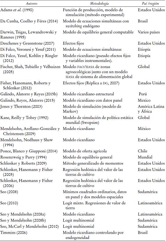 El número de trabajos enfocados a analizar los efectos económicos del cambio climático en la agricultura continuó su crecimiento y a la fecha se cuenta con una muy amplia literatura en el tema.2 La mayor parte de esa literatura aborda el tema desde una perspectiva predominantemente empírica; incluso los trabajos teóricos que existen en el área enfatizan la importancia de abordar el tema desde dicha perspectiva. A continuación se presentan los resultados principales de algunos de los trabajos más relevantes sobre la relación entre cambio climático y agricultura. Asimismo, se describe la evolución metodológica que ha tenido el análisis de los efectos del cambio climático en la agricultura.