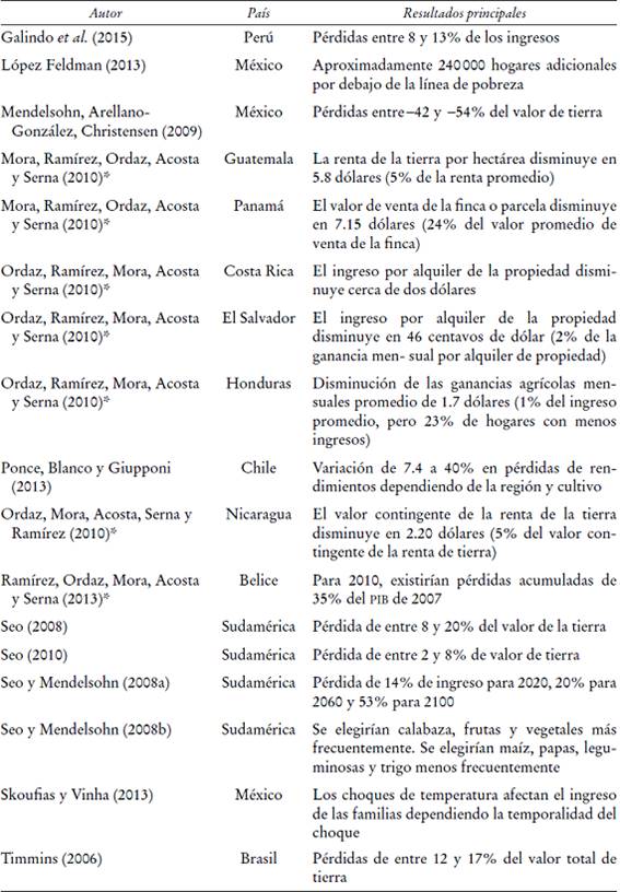Más allá de los estudios que analizan los datos obtenidos por el Banco Mundial, existe otra serie de estudios que analizan distintas bases de datos para países de América Latina. Entre ellos está el de Timmins (2006) para Brasil, en el que se utiliza un modelo estructural de uso endógeno del suelo que permite predecir los efectos del cambio climático tanto en un escenario de cero costos de ajuste como en uno en donde los costos de ajuste son tan altos que los individuos no cambian su comportamiento en respuesta al cambio climático. El autor propone resolver el problema de endogeneidad mediante el uso de variables instrumentales, específicamente mediante el uso de variables que afectan el valor de la tierra en usos alternativos al estudiado. Sus resultados muestran que los efectos del cambio climático son menos negativos de lo que el método ricardiano tradicional predice. Otro estudio para Brasil es el de Da Cunha, et al. (2015), quienes realizaron una de las pocas estimaciones econométricas en las que explícitamente se modela la decisión de adopción de irrigación para un país latinoamericano. Estos autores encuentran que ante variaciones climáticas el valor de la tierra irrigada es más estable que el de la no irrigada. Por su parte, Galindo, et al. (2015a) estiman un modelo ricardiano estructural en el que la elección de cultivos es endógena. De acuerdo con sus estimaciones, basadas en una muestra de más 100 000 productores en Perú, la elección de cultivos podría alterarse de manera importante en respuesta al cambio climático (e. g., menos siembra de papa y más siembra de maíz y plátano). El efecto estimado en el ingreso de los productores, una vez que se toma en cuenta el cambio en la mezcla de cultivos, es de entre -8 y -13%.