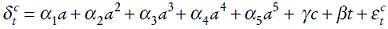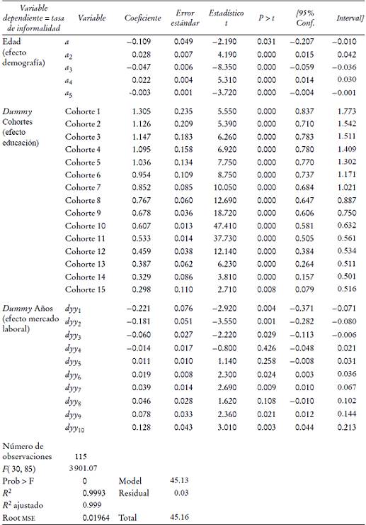 La estructura polinomial para a se justifica bajo el argumento de que la variable de interés (en éste la tasa de informalidad X) puede variar por diversos motivos a lo largo del ciclo de vida −por ejemplo, la población más joven puede estar dispuesta a ingresar a un empleo informal para acumular experiencia que posteriormente se utilice en el mercado formal, mientras que en el caso de c y t no se impone una estructura específica−.