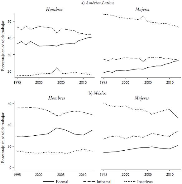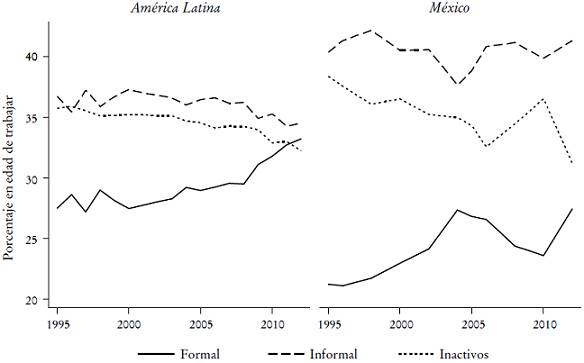 Los resultados para México se encuentran en el panel derecho de la misma gráfica, donde se observan tres diferencias importantes: i) el nivel de informalidad es significativamente mayor en este país; entre 38 y 42% de la PET, ii) mientras que en América Latina se observa una modesta reducción de la informalidad, en México se registra un ligero incremento, y iii) en México la población con empleos formales es una minoría de la PET, comparada con el resto de la región, en donde su peso relativo es similar al del grupo de trabajadores informales y de población inactiva.