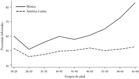Nuevamente, México presenta diferencias importantes en estos patrones. Para el grupo de 18 a 25 años la informalidad está casi 10 puntos por encima, y aunque la brecha se reduce prácticamente a la mitad para la edad de 26 a 30 años, crece a una velocidad considerablemente mayor a partir de entonces, de manera que en el grupo de 51 a 55 años la diferencia es de 15 puntos, y alcanza niveles de 83% en el rango de 61 a 65 años −una brecha de 30 puntos con respecto al promedio regional−.