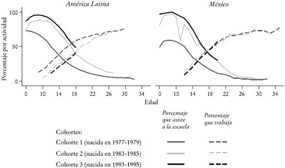 El panel derecho de la misma gráfica presenta los datos de México para las mismas cohortes y permite observar dos diferencias principales −nótese que la línea de la cohorte 3 para la población que trabaja no se distingue debido a que la línea para la cohorte 1 se sobrepone a ella−. La primera es la mayor magnitud del cambio educativo observado en México entre las cohortes 1 y 3 (consistente con el mayor esfuerzo educativo identificado en la Gráfica 8). La segunda es que a diferencia del promedio regional, la edad de inserción al mercado laboral y los niveles de empleo parecen mantenerse a niveles similares durante las generaciones analizadas.