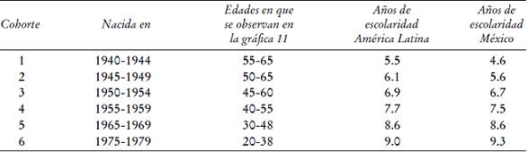 Así como puede seguirse la transición de las edades escolares a las laborales, los datos permiten seguir a distintas generaciones durante la etapa laboral de su ciclo de vida, distinguiendo a su vez entre su inserción formal o informal. Para ello, construimos siete generaciones nacidas entre 1935-1939 y 1975-1979 para el promedio de América Latina y para México.17 El Cuadro 2 identifica los años en que nació cada generación, las edades durante las cuales es posible observarlas en las encuestas de hogares, y sus respectivos años de escolaridad.18