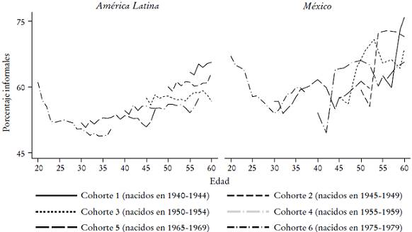Una tercera diferencia es que, mientras para el promedio de la región no se registran cruces en las trayectorias de informalidad de cada generación, para México se observan múltiples intersecciones. Además, a diferencia del promedio de la región, las tasas de informalidad de distintas cohortes se mueven en dirección opuesta durante periodos de envejecimiento similares. Por ejemplo, entre los 50 y 60 años la informalidad de la cohorte 4 aumenta, mientras que en la cohorte 3 cae.22