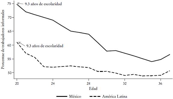 Ahora bien, hacia mediados de la década de 1990 el avance educativo de México ya había superado al promedio de la región, de forma tal que los trabajadores mexicanos de esa generación tenían 9.3 años de escolaridad vs. nueve para la región. De la gráfica se desprende que, a pesar de eso, cuando los trabajadores tenían 20 años, la tasa de informalidad en México era casi 15 puntos porcentuales más alta, y se mantuvo por encima de la del promedio de la región durante todo el periodo de observación.