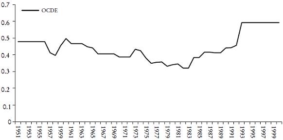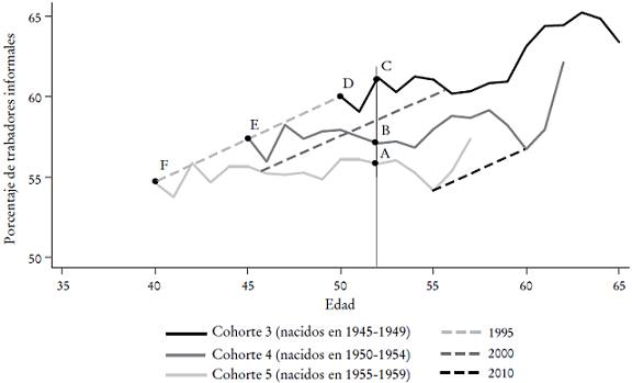 Por último, el estado del mercado laboral en un año calendario dado se refleja en las tasas de informalidad de las distintas cohortes a la edad correspondiente a cada una de ellas en ese año calendario. Así, los punto D, E y F sobre la línea punteada corresponden al año 1995, cuando la cohorte 5 tenía 40 años de edad y una tasa de informalidad de 55% (punto F), la cohorte 4 tenía 45 años de edad y una tasa de informalidad de 57% (punto E), y la cohorte 3 tenía 50 años y una tasa de informalidad de 60% (punto D).25 La evolución del efecto mercado laboral en la ecuación (1), captada por los coeficientes del vector β, corresponde gráficamente a movimientos paralelos de la líneas punteadas (como las líneas punteadas más oscuras en la Gráfica 13, referidas a los años 2000 y 2010, respectivamente).