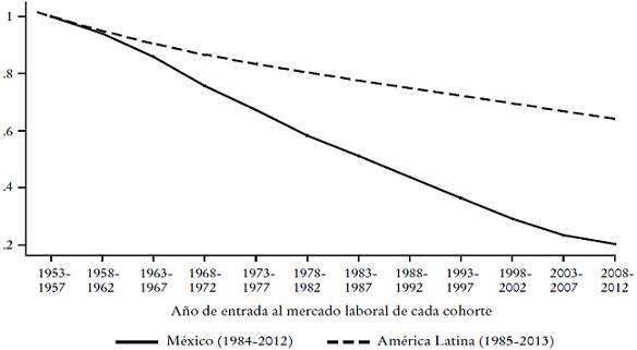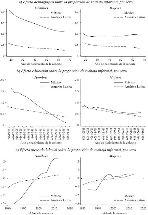 Dilucidar los factores que están detrás de este último efecto y entender por qué en México ha operado de manera tan diferente en comparación con el promedio de América Latina, constituye una investigación que está fuera del alcance del presente estudio. Como ya comentamos, el efecto del mercado laboral recoge tanto factores estructurales asociados a las regulaciones fiscales, laborales, de aseguramiento social y otras, como de orden coyuntural asociado al ciclo macroeconómico.