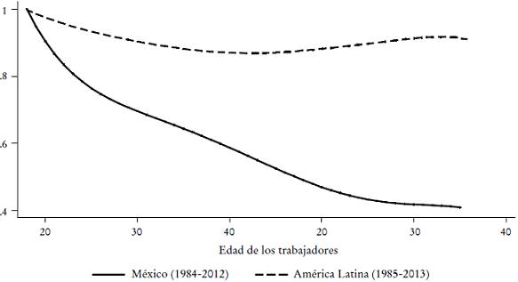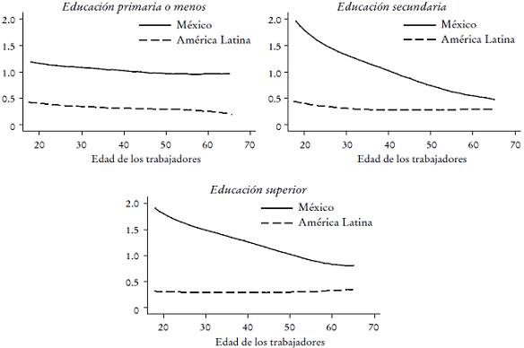 Los resultados de las estimaciones para México se presentan en el Apéndice en el Cuadro A2 para los trabajadores de todos los niveles educativos, mientras que el Cuadro A3 del Apéndice especifica el número de observaciones (cohortes-años) disponibles y utilizadas para cada país. Como puede observarse, los coeficientes de las variables dicotómicas que captan los efectos educativos, demográficos, y para una mayoría de los efectos de mercado laboral, son altamente significativos. En el caso de los promedios regionales, su estimación se realiza tomando los coeficientes obtenidos para cada país (con la misma estructura que el Cuadro A2), y se “suavizan” para su presentación gráfica a continuación.