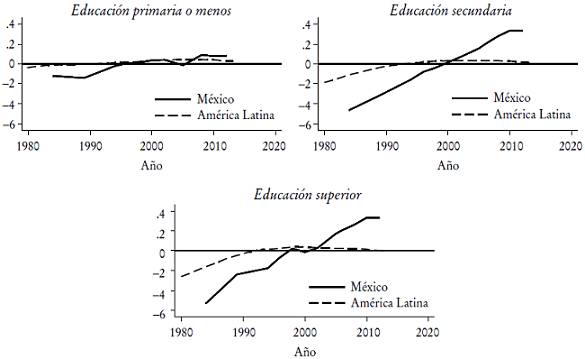 Las trayectorias estimadas para el efecto educación para el promedio de América Latina y para México se presentan en la Gráfica 14.27 Se observa que en ambos casos el efecto es decreciente, lo que indica que, ceteris paribus, este efecto contribuye a que la informalidad disminuya. Nótese que el efecto es más pronunciado para México que para el resto de América Latina. Esto es consistente con lo señalado en la sección anterior: en la medida que el aumento en años de escolaridad entre generaciones en México supera al promedio de la región, se espera que sólo por este efecto la caída de la informalidad sea mayor.