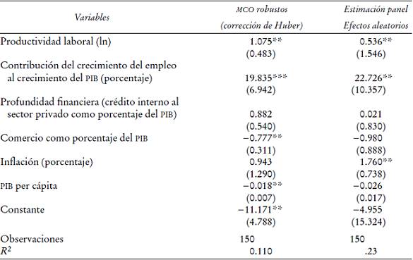 El resultado principal, consistente con nuestra interpretación del término βt en la regresión (1) como reflejo del efecto del mercado laboral, es que las dos variables que de manera consistente muestran una relación estadísticamente significativa con los valores de β, son las variables de productividad laboral y de contribución del factor trabajo al PIB. Las variables que representan el nivel y la estabilidad de la actividad económica son significativas también, aunque no en ambos modelos. La variable que mide los flujos de comercio como proporción del PIB es también significativa, aunque solamente en la regresión por MCO.