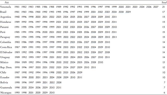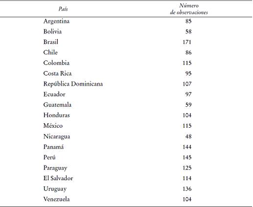 Analizamos 233 levantamientos de diversas encuestas de hogares que cubren el periodo 1980-2013 para 18 países;7 el Cuadro A1 en el Apéndice identifica el número de levantamientos por país y año. En términos generales se incluyen 21 casos para Venezuela, 17 para Brasil, 15 para Argentina, Honduras, Panamá, Paraguay y Perú, 14 para Colombia, Costa Rica, El Salvador y Uruguay, 13 para México, 12 para República Dominicana, 10 para Chile y Ecuador, siete para Guatemala y Bolivia, y seis para Nicaragua. A excepción de las encuestas para Uruguay, Argentina y Bolivia para años previos al 2000, que son solamente representativas de áreas urbanas, todas las restantes son representativas a nivel nacional; 9% son para el periodo 1980-1989, 31% pertenecen a los años 1990-1999, y 60% abarcan los años 2000 a 2012. En conjunto, los datos son representativos de una población de 554 millones de personas, equivalente a 96% de la población de América Latina.8