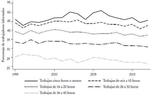 Dicho esto, es interesante notar que las variables de orden macroeconómico no muestran una tendencia especialmente desfavorable para México comparado con el resto de la región, sobre todo a partir de mediados de los noventa. De hecho, indicadores como la volatilidad de la tasa de crecimiento del PIB o del tipo de cambio, el nivel y la volatilidad de la tasa de inflación, o los déficits fiscales o en cuenta corriente, muestran lo contrario: en términos relativos México ha tenido un ambiente de mayor estabilidad macroeconómica. Por eso, y porque además el periodo de mayor estabilidad macroeconómica en México coincide con el periodo de aumento en la informalidad laboral, consideramos que la persistencia de la informalidad en este país a pesar del avance educativo deriva de factores estructurales del mercado laboral, y no de choques macroeconómicos transitorios.