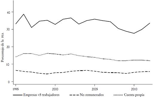 Quizás el hecho más sorprendente es que en el transcurso de los 17 años observados, el porcentaje de trabajadores informales se redujo solamente de manera marginal −de 37 a alrededor de 35%−. El empleo formal aumentó, pero este incremento solamente alcanza alrededor de cinco puntos porcentuales. El que la composición de la población en estas tres categorías no haya cambiado de manera sustantiva a nivel regional durante la década del 2000 en la que se observó un entorno económico positivo, sugiere que el dinamismo no logró traducirse de manera notable en más oportunidades laborales formales.10