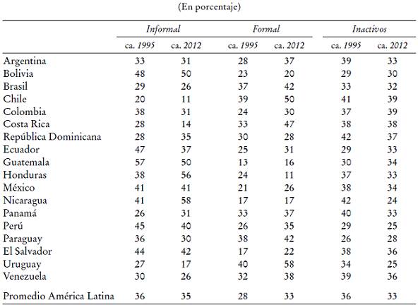 Al observar el desglose de la informalidad por género en la región en la Gráfica 2, puede apreciarse que el porcentaje de población inactiva es mucho mayor entre las mujeres −45% en el 2012 vs. 17% para los hombres−. Sin embargo, también se observan similitudes, como por ejemplo, que entre 1995 y 2012 la tasa de informalidad para ambos casos haya permanecido prácticamente inalterada. Otra similitud es que aunque crece la tasa de formalidad, el incremento es sólo incipiente -de entre cuatro y seis puntos en 17 años-.