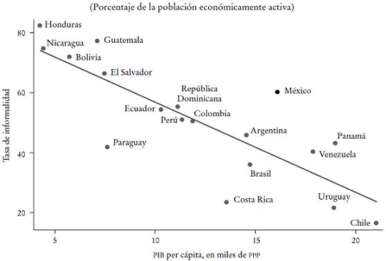 Estudios recientes en la región muestran que en general existe una correlación negativa entre los niveles de informalidad y el nivel de desarrollo de los países medido por su ingreso per cápita −a menor ingreso mayor informalidad−. Sin embargo, un país que no se conforma de estos patrones es México, que a pesar de presentar uno de los mayores niveles de ingreso por persona en la región, es también uno de los que presenta mayores tasas de informalidad.3 Además, a diferencia del promedio de la región, en México la informalidad se ha mantenido prácticamente constante en las últimas dos décadas. Estos hechos han despertado el interés de distintos autores, que han establecido adicionalmente que existe una conexión estrecha entre la informalidad y los bajos niveles de productividad en México, los cuales se han convertido en un cuello de botella crítico para el crecimiento y el desarrollo.4