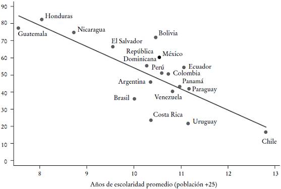 La persistencia de la informalidad en México, a pesar de los avances educativos, sorprende debido a que en general se esperaría que más escolaridad se tradujera en mayor formalidad laboral (Perry, 2007). Lo anterior debido a que, por un lado, se espera que la educación eleve la productividad de la economía, facilitando a empresas y trabajadores absorber los costos de aseguramiento social contributivo, que es la característica distintiva de la formalidad; y por otro, porque en tanto las empresas más grandes son más intensivas en capital humano, se esperaría que una oferta creciente de trabajadores educados debiera facilitar su desarrollo, lo que a su vez tendería a generar mayor formalidad por la relación positiva entre mayor tamaño de la empresa y mayor cumplimiento de las regulaciones de aseguramiento contributivo (dada la mayor probabilidad de detección a la violación de estas regulaciones).