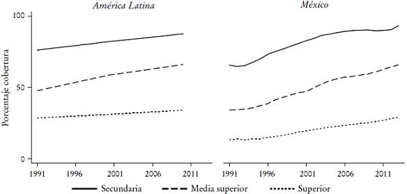 Estos contrastes son interesantes por otra razón: en las últimas décadas el progreso educativo en México ha superado el promedio de América Latina, lo cual hubiera llevado a esperar niveles de informalidad decrecientes. Esto se observa en la Gráfica 8, donde resaltan dos hechos: i) a principios de la década de 1990 la cobertura en todos los niveles en México era inferior al promedio regional; ii) sin embargo, en las siguientes dos décadas el avance en México fue mayor. Mientras que la tasa de cobertura de educación secundaria se incrementó alrededor de 15 puntos porcentuales en la región entre 1990 y 2012, en México aumentó 42 puntos. En la EMS el cambio es de 39 puntos porcentuales en la región vs. 93 en México. Lo mismo sucede en la ES: 19 puntos porcentuales en América Latina vs. 117 en México.13