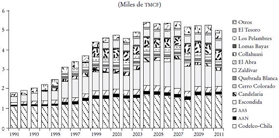 La importancia actual del cobre ha sido consecuencia de un incremento reciente del producto cuprífero nacional. Entre 1991 y 2011, la producción creció 2.9 veces, de 1.8 a 5.2 millones de toneladas métricas de cobre fino (TMCF) (Cochilco, 2011). Como se observa en la Gráfica 2, este incremento se debe a grandes inversiones del sector privado, principalmente por empresas extranjeras.