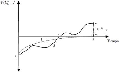 Para la concesión de un recurso que no permite la apropiación privada de renta (flujo 1), la RVP puede o no ser parsimoniosa como en la Gráfica 3, siendo sólo esencial que converja en cero en algún momento lejano en que t converge en τ. Por su parte, en una concesión de un recurso que permite la apropiación privada de renta (flujo 2), la RVP paga la inversión inicial en un tiempo acotado, momento “x”, luego del cual toda la utilidad contable que obtiene corresponde a renta apropiada por el agente.