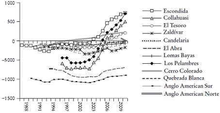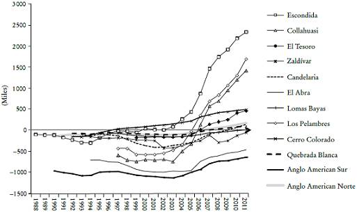 Varias empresas cupríferas han percibido renta. Entre ellas destacan especialmente Escondida y Los Pelambres, seguidas por Collahuasi. Contrariamente, se puede notar que Zaldívar y especialmente El Abra y Anglo American Sur no lo han hecho. Por su parte, Lomas Bayas, Anglo American Norte y Candelaria aparecen apropiándose de una renta sutil, posiblemente sensible a la tasa de descuento.