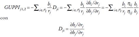 Adecuando la fórmula original del GUPPI para una concentración que involucre dos bancos que emiten múltiples tarjetas de crédito, por ejemplo, emisores 1 y 2, el GUPPI de la tarjeta j del emisor 1, se puede definir como sigue: