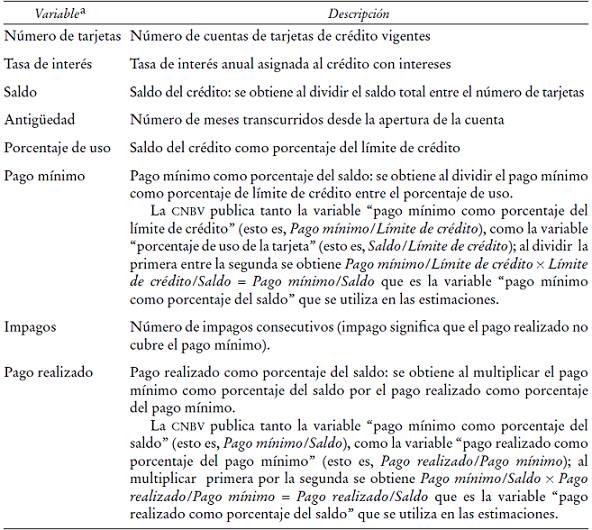 En el Cuadro 1 se describen las variables utilizadas; en todos los casos se usan las definiciones establecidas en el formulario que utiliza Banco de México (Banxico) para recabar la información de los bancos emisores.9 Ahora bien, algunas variables que se recaban en el formulario no se publican directamente en la página de internet de la CNBV, pero es posible derivarlas utilizando equivalencias algebraicas con otras que sí se publican, sin cambiar las definiciones del formulario.