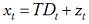 (1)donde TDt representa el componente determinístico (que refleja los fundamentos económicos, pero puede verse afectado por choques ocasionales mayores) y zt representa el componente estocástico (que no muestra ninguna tendencia ni a la alza ni a la baja, pero puede ser I(0) o I(1) sin deriva, y sirve para capturar los efectos de los choques periódicos). Asimismo, sus resultados sugieren que el término para la tendencia determinística en el trabajo empírico es TDt = 𝜙0 + 𝜙1t, donde 𝜙0 y 𝜙1 son constantes en la mayoría de las especificaciones, pero pueden generalizarse para incluir rompimientos esporádicos: la forma en que los cambios en los fundamentos económicos se relacionan con el fenómeno de tendencias con rompimientos, es decir, un cambio en los coeficientes 𝜙0 y 𝜙1. Carrion-i-Silvestre, et al. (2005) usan esto en su especificación número tres.