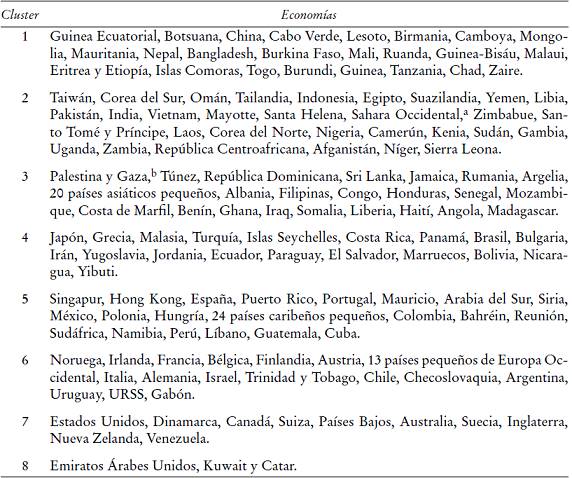 Las 145 economías de Maddison (2003b) se clasifican en ocho clusters (véase el Cuadro 1). En el octavo se ubican las tres economías más ricas en 1950 según su PIBPC: Catar, Kuwait y los Emiratos Árabes Unidos, que son, además, países productores de petróleo. Posteriormente, definimos tres grupos de algoritmos de agrupamiento para las 142 economías restantes: el primero con 115 economías, el segundo con 17 y el tercero con 10. Dado que el grupo de 115 economías es muy extenso y heterogéneo, lo subdividimos en cinco clusters. De este modo, tenemos ocho clusters en total empleando el PIBPC de 1950. Las economías más pobres se ubican en los primeros clusters y las más ricas en el octavo cluster. Consideramos que las economías de cada cluster tienen un generador de procesamiento de información en común.