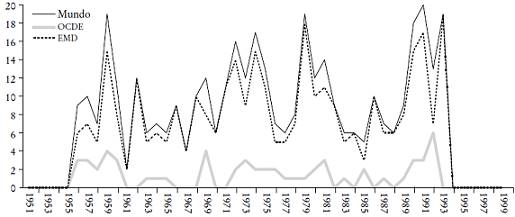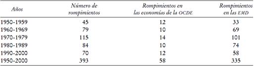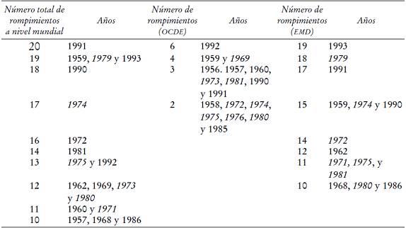 En total se detectaron 393 rompimientos en las 145 economías: 58 en las economías de la OCDE (14.76%) y 335 en las EMD (85.24%), mientras que la década de 1970 se distinguió por tener tan sólo 115 rompimientos (Cuadro 5).