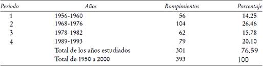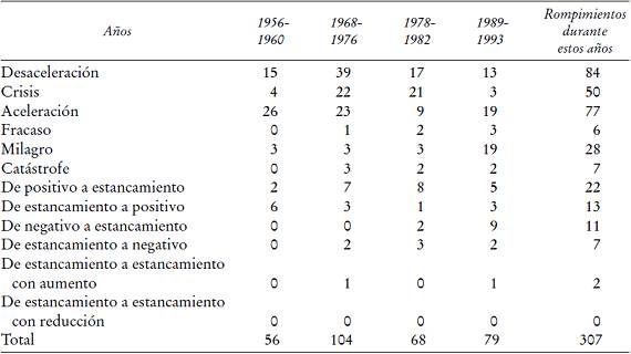 En el primer periodo de rompimientos (1956-1960) abundan las aceleraciones: 26 de 56, seguidas en frecuencia por las desaceleraciones, que suman 15. En el segundo periodo (1968-1976), hay 39 desaceleraciones y 23 aceleraciones, de un total de 104 rompimientos. En los cinco años del tercer periodo (1978-1982), los fenómenos más frecuentes son 19 crisis y 17 desaceleraciones, de un total de 68 rompimientos. Por último, en el periodo de rompimientos más reciente (entre 1989 y 1993), hay 19 aceleraciones y 19 milagros, de un total de 79 rompimientos. Entonces, en términos generales, el primero podría clasificarse como un periodo de éxito (aceleraciones); el segundo como un periodo de desilusión (desaceleraciones y crisis); el tercero, también como un periodo de fracaso (dominado por crisis y desaceleraciones); y el último, dado que el número de aceleraciones fue apenas mayor que el número de milagros, podría clasificarse como un momento de reactivación (Cuadro 8).