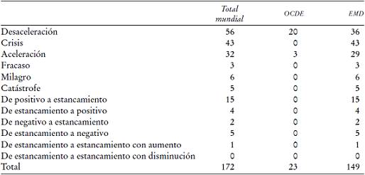 A fin de determinar si las economías miembro de la OCDE tuvieron una desaceleración antes que las EMD, analizamos los rompimientos durante el periodo 1968-1982 para todas las economías del mundo, incluyendo el tipo de economía (OCDE y EMD). Durante estos 15 años, hallamos 172 rompimientos, 56 desaceleraciones (54.90% de las 102 desaceleraciones que ocurrieron durante todos los años) y 43 crisis (71.67% de un total de 60 crisis). Las economías de la OCDE sufrieron 20 desaceleraciones y cero crisis. Las EMD pasaron por 43 crisis y 36 desaceleraciones; además, estas economías experimentaron 15 cambios en los que pasaron de tener una tasa de crecimiento de largo plazo positiva al estancamiento, cinco catástrofes y tres fracasos (Cuadro 9). Éste es el periodo de la Gran Desaceleración.