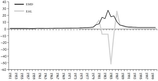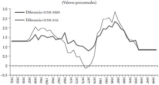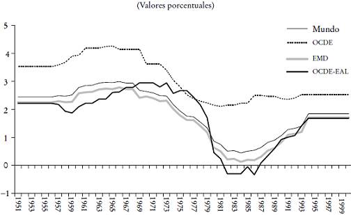 Las tasas de crecimiento de largo plazo promedio de las economías miembro de la OCDE siempre han sido superiores a las tasas de crecimiento de largo plazo promedio de las EMD (Gráfica 5), pero ambas disminuyeron a partir de la década de 1970, y la diferencia entre ellas aumentó después de 1976 y hasta 1992. Además, las tasas de crecimiento a largo plazo promedio de las EAL fueron muy elevadas durante la década de 1970. En cambio, la situación en la década siguiente fue crítica en estas economías que presentaron tasas promedio negativas (Gráficas 5 y 6).