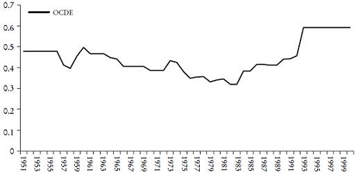Se separarán estos cambios con base en dos tipos de economías: 22 miembros de la OCDE antes de 1993: Turquía, Grecia, Japón, Portugal, España, Irlanda, Italia, Austria, Alemania, Finlandia, Francia, Bélgica, Noruega, Países Bajos, Suecia, Inglaterra, Dinamarca, Canadá, Australia, Nueva Zelanda, Suiza y los Estados Unidos debido a que la base de datos de Maddison (2003b) no incluye datos sobre las economías de Islandia ni de Luxemburgo, miembros de la OCDE antes de 1993; 123 economías menos desarrolladas, incluyendo 24 economías latinoamericanas (Argentina, Bolivia, Brasil, Colombia, Costa Rica, Cuba, Chile, República Dominicana, Ecuador, El Salvador, Guatemala, Haití, Honduras, Jamaica, México, Nicaragua, Panamá, Paraguay, Perú, Puerto Rico, Trinidad y Tobago, Uruguay, Venezuela); y 24 economías caribeñas pequeñas.