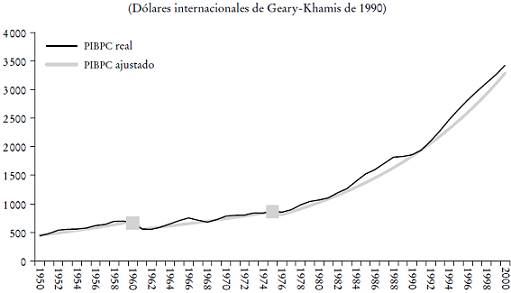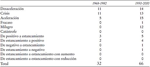 Esta situación derivó en los siguientes regímenes de crecimiento durante la segunda mitad del siglo veinte: 102 desaceleraciones, 60 crisis, 108 aceleraciones, siete fracasos, 40 catástrofes, 26 cambios en la pendiente de tasas de crecimiento positivas a tasas estadísticamente no significativas, 19 del estancamiento al crecimiento positivo, 13 de tasas negativas al estancamiento, siete rompimientos del estancamiento a tasas negativas, dos rompimientos con un aumento en el PIBPC pero del estancamiento al estancamiento, y uno con disminución en el PIBPC entre dos periodos de tasas de crecimiento no significativo (Cuadro 3).
