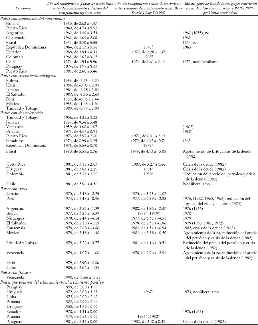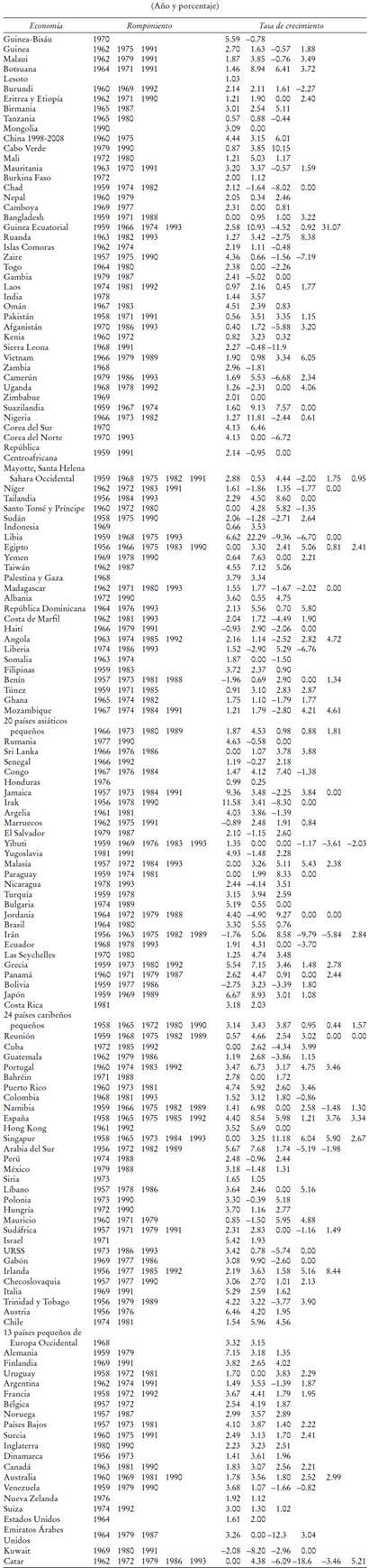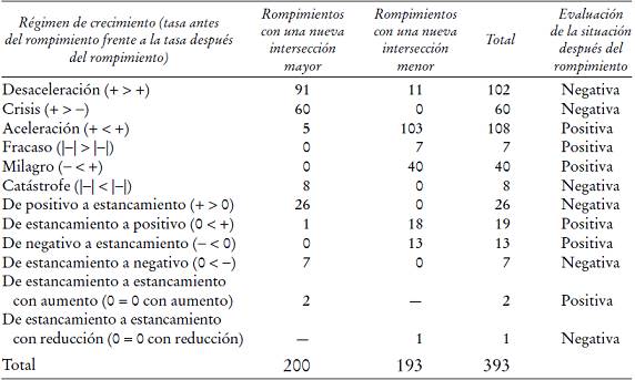 Anteriormente se definieron doce tipos de rompimientos (cambios estructurales o cambios estadísticamente significativos de la tasa de crecimiento) en función del cambio en la tasa de crecimiento a largo plazo. Por lo tanto, con el número de rompimientos y la fecha de los mismos, podemos clasificar estos cambios estructurales comparando la tasa de crecimiento promedio antes del rompimiento con la tasa promedio posterior al rompimiento hasta el siguiente rompimiento.