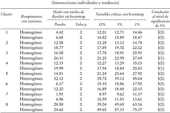 Tras aplicar la prueba de estacionariedad con datos de panel con múltiples rompimientos, con dependencia entre las economías y variables homogéneas, no se puede rechazar la hipótesis nula de un panel estacionario para los ocho clusters a un nivel de significancia de 5% (Cuadro 2). Sin embargo, si en la prueba se considera que la varianza es heterogénea, no se puede rechazar la hipótesis de estacionariedad con rompimientos en seis de los ocho clusters: uno, dos, cinco, seis, siete y ocho (Cuadro 2). El número de rompimientos, sus años respectivos y sus tasas de crecimiento por economía se incluyen en el Apéndice.