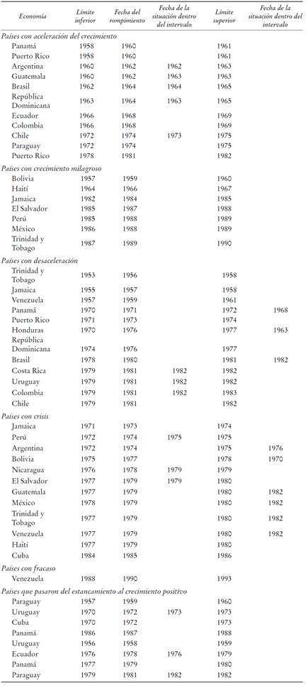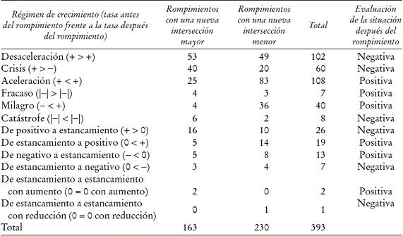En resumen, de estos cuatro tipos de rompimientos o lapsos, el más frecuente es la desaceleración (84 de 254, o 33.07%), seguido por la aceleración (65 de 254, o 35.59%), la crisis (49 de 254, o 19.29%) y el milagro (32 de 254 o 12.60%). De menor importancia, debido a su poca frecuencia, son las catástrofes y los fracasos (12 eventos y 11 eventos, lo que equivale a 5.12 y 4.33%, respectivamente) (Cuadro 8).