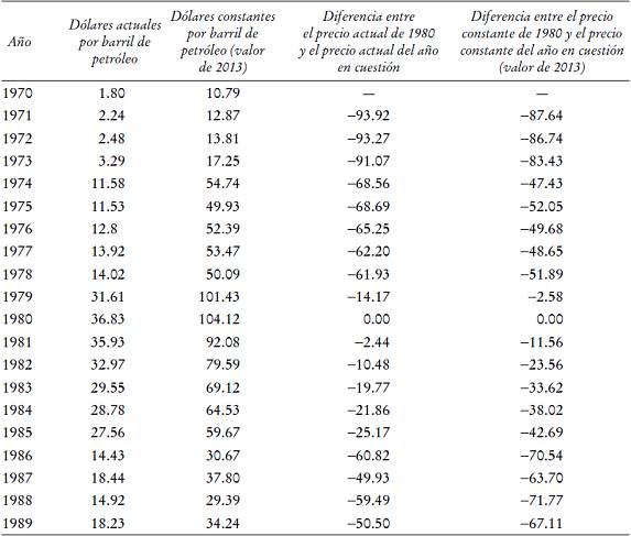 Durante la década de 1970, el precio del petróleo subió hasta llegar a su nivel más alto en 1980 (Cuadro 13), pero durante la década siguiente la situación cambió, por lo que las EAL exportadoras de petróleo no pudieron satisfacer sus deudas internacionales (Cuadro 14) −véase Colmenares, (2008)−. La gestión de acreedores y deudores durante esa década, así como otras políticas económicas, representaron problemas importantes para estos países −véase Devlin y Ffrench-Davis (1995) −.