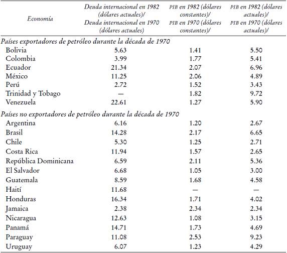 Las EAL y otras EMD padecieron un endeudamiento externo con el sistema bancario privado internacional en la década de 1970, años que se caracterizaron por la presencia de ávidos prestamistas. Por ejemplo, la deuda del Ecuador se multiplicó más de 20 veces entre 1970 y 1982, pero su PIB en dólares actuales sólo se sextuplicó durante ese periodo y el PIB en dólares constantes se duplicó (Cuadro 14). Sin embargo, surgió una crisis por la escasez de financiamiento externo en los primeros años de la década de 1980 y los ajustes económicos y las reformas que se implementaron para resolver este problema trajeron consecuencias económicas y sociales: desempleo, pobreza, hiperinflación y privatización. Estas situaciones definen la Década Perdida.