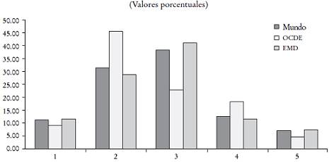La volatilidad de las tasas de crecimiento medida según los coeficientes de variación fue muy diferente para las economías de la OCDE, las EMD y las EAL. Este indicador estadístico nos muestra los diversos problemas que padecieron estas dos últimas (Gráficas 7 y 8).