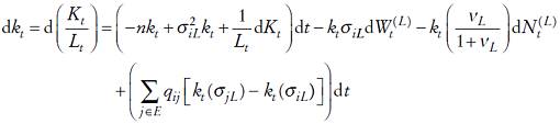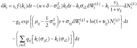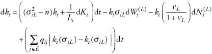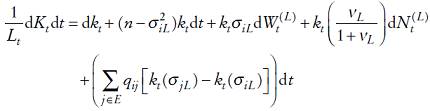 (8)lo cual proporciona la dinámica estocástica del capital per cápita y su relación con el capital total disponible en la economía. Asimismo, en la ecuación (8) se aprecia la forma que se relaciona el cambio marginal en el capital per cápita con los parámetros que caracterizan la economía, la población, el gasto público y el estado de volatilidad.