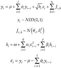 Se filtraron las tasas de crecimiento de la población y del gasto público per cápita para obtener estimaciones de sus volatilidades y de los componentes no esperados de los saltos. Para lo anterior se siguió el procedimiento sugerido por el modelo de saltos en tiempo discreto de Chan y Maheu (2002) en el cual se combina la especificación del salto con un modelo GARCH para la volatilidad. Considerando Ωt−1, el historial pasado de yt , como el conjunto de información disponible, el modelo de saltos puede escribirse como: