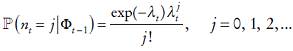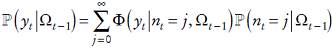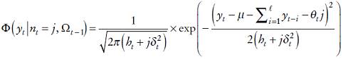 (15)que es una mezcla de distribuciones conducida por una distribución de Poisson variante en el tiempo. Debido a los supuestos en (10), la distribución de yt condicionada por Ωt−1 y j saltos sigue una distribución normal de acuerdo con