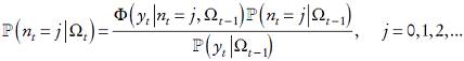 (13)Al considerar Ωt−1 en el Teorema de Bayes, y al observar el valor de yt , se puede inferir la probabilidad de que ocurran j saltos en el tiempo t filtrando los datos observados mediante