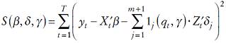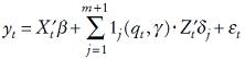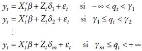 (16)lo que permite dividir las variables regresoras en dos grupos: las que no varían entre los regímenes (X) y las que sí lo hacen (Z). Si se considera que existe una variable de umbral, qt y valores de umbral estrictamente crecientes,