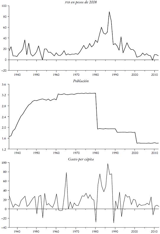 En esta sección se estudia la relación entre la tasa de crecimiento anual del PIB y las tasas anuales de crecimiento de la población mexicana y del gasto per cápita de 1936 a 2012. Los datos del PIB y del gasto público se tomaron en pesos constantes con 2008 como el año base. Como puede verse en la Gráfica 1, el PIB en México observó tasas de crecimiento bastante estables entre las décadas de 1950 y 1970, de modo que empezó a crecer en forma sostenida posteriormente hasta alcanzar el máximo que lo llevó a una caída notoria que lo mantiene en las actuales tasas de crecimiento. Las tasas son notoriamente menores incluso que las que se alcanzaron durante la primera parte del periodo analizado. En cuanto al crecimiento de la población, se observa un crecimiento acelerado desde la segunda parte de la década de 1930 hasta fines de la década de 1970 para caer y mantenerse durante poco más de 20 años alrededor de la mitad del crecimiento máximo. Desde principios del siglo XXI se observa una tasa de crecimiento poblacional más baja que en los años previos, como posible consecuencia de los programas de control natal. En lo que respecta a la tasa de crecimiento del gasto público per cápita, se tiene que siempre ha sido muy baja, pero con una fuerte caída a principios de la década de 1980.