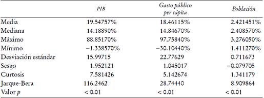 Como puede verse en el Cuadro 1, la prueba de Jarque y Bera rechaza el supuesto de que las tasas de crecimiento anual de las tres variables analizadas correspondan a una distribución normal, con lo que se destaca en particular el exceso de curtosis en las distribuciones del crecimiento del PIB y del gasto público per cápita.