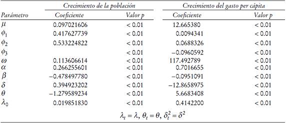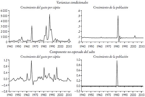 En el Cuadro 2 se muestran los parámetros de los modelos AR-GARCH de saltos con intensidad constante estimados mediante el método de máxima verosimilitud. Con base en los modelos estimados se obtienen las volatilidades (varianzas) condicionales del crecimiento de la población y del crecimiento del gasto público per cápita, así como las estimaciones del componente no esperado de los saltos en ambas tasas de crecimiento. En la Gráfica 2 se muestran esos elementos.