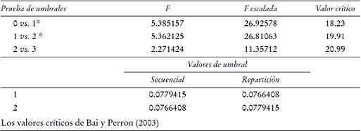 Debido a que los resultados de la prueba secuencial de Bai y Perron (1998) sugieren que existen dos umbrales, se procedió a estimar el modelo de tres regímenes que se presenta en el Cuadro 4 tomando como valores para determinar los umbrales los sugeridos también por la prueba de Bai y Perron. En general se puede decir que el ajuste del modelo estimado es satisfactorio en cuanto a su cumplimiento con los supuestos de mínimos cuadrados ordinarios; por ejemplo, en los residuos no se observan problemas de heteroscedasticidad, autocorrelación, ausencia de normalidad o presencia de efectos ARCH.